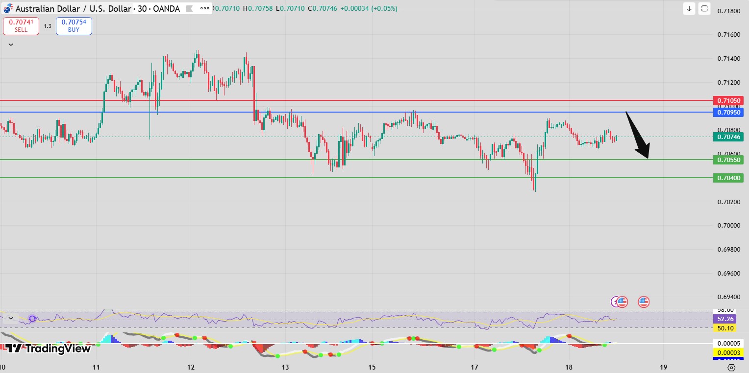 Alternatively, a sustained break above 0.7095 would weaken the bearish scenario and open the path toward 0.7105 and 0.7120, where higher resistance levels are positioned.