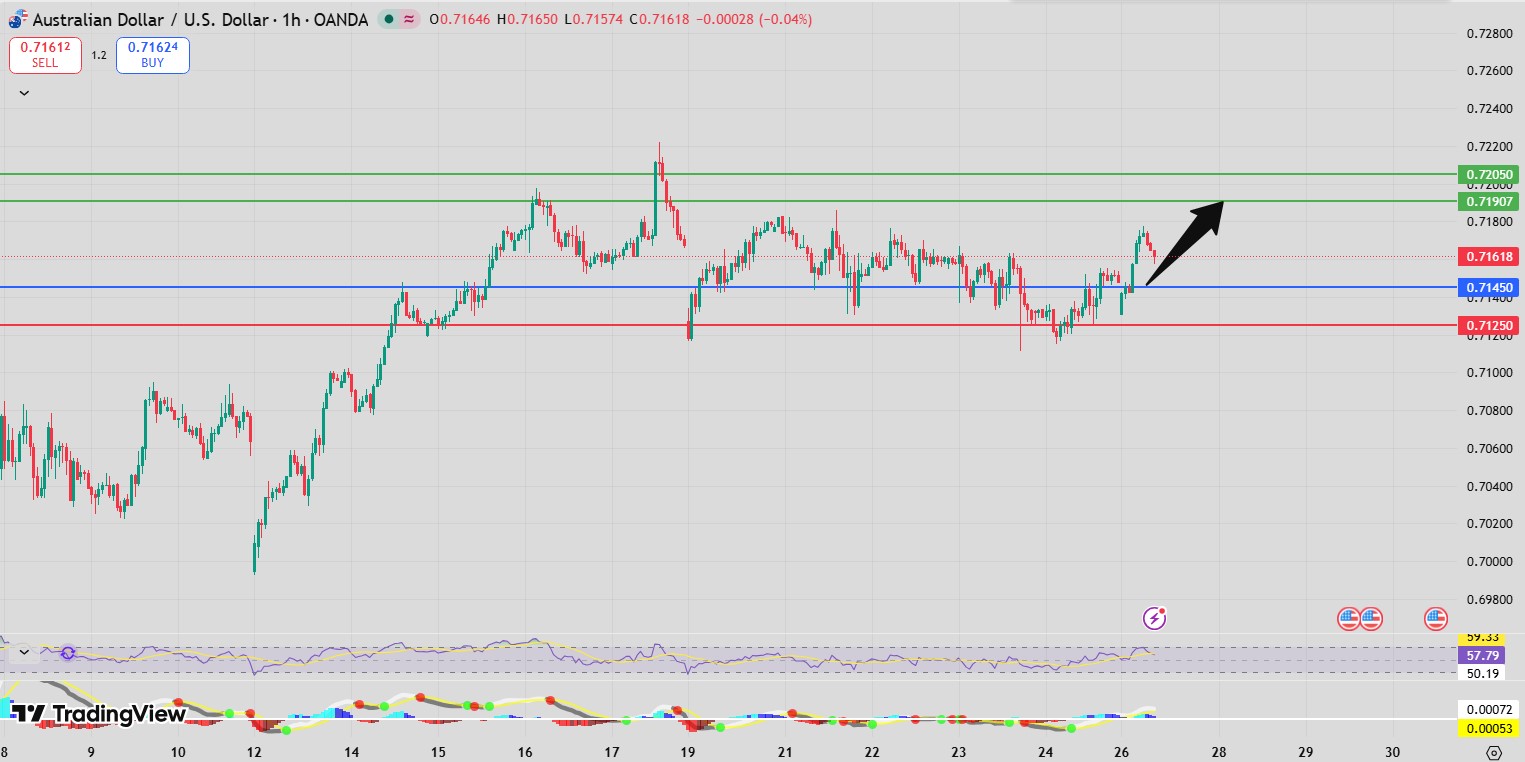 The AUD/USD Intraday Signal reflects constructive momentum following the break above the pivot level at 0.7145. This breakout acts as a positive signal and opens the path toward 0.7190. As long as price remains supported above 0.7145, the bullish intraday bias stays intact.
