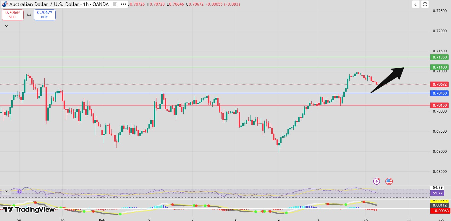 Description : AUD/USD consolidates above 0.7045, maintaining a bullish bias toward 0.7110 and 0.7135.
