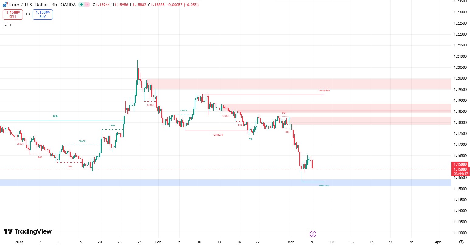 The latest impulsive move created a weak low near 1.1550, indicating that liquidity remains below the current market price. The small rebound seen now appears to be a short-term retracement rather than a structural reversal.