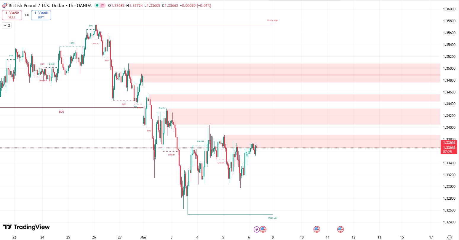 GBP/USD on the 1-hour timeframe remains within a bearish short-term structure after a strong impulsive decline that created a clear Break of Structure (BOS) below the 1.3400 level. This move confirmed that sellers gained control following the rejection from the 1.3550–1.3580 supply zone.