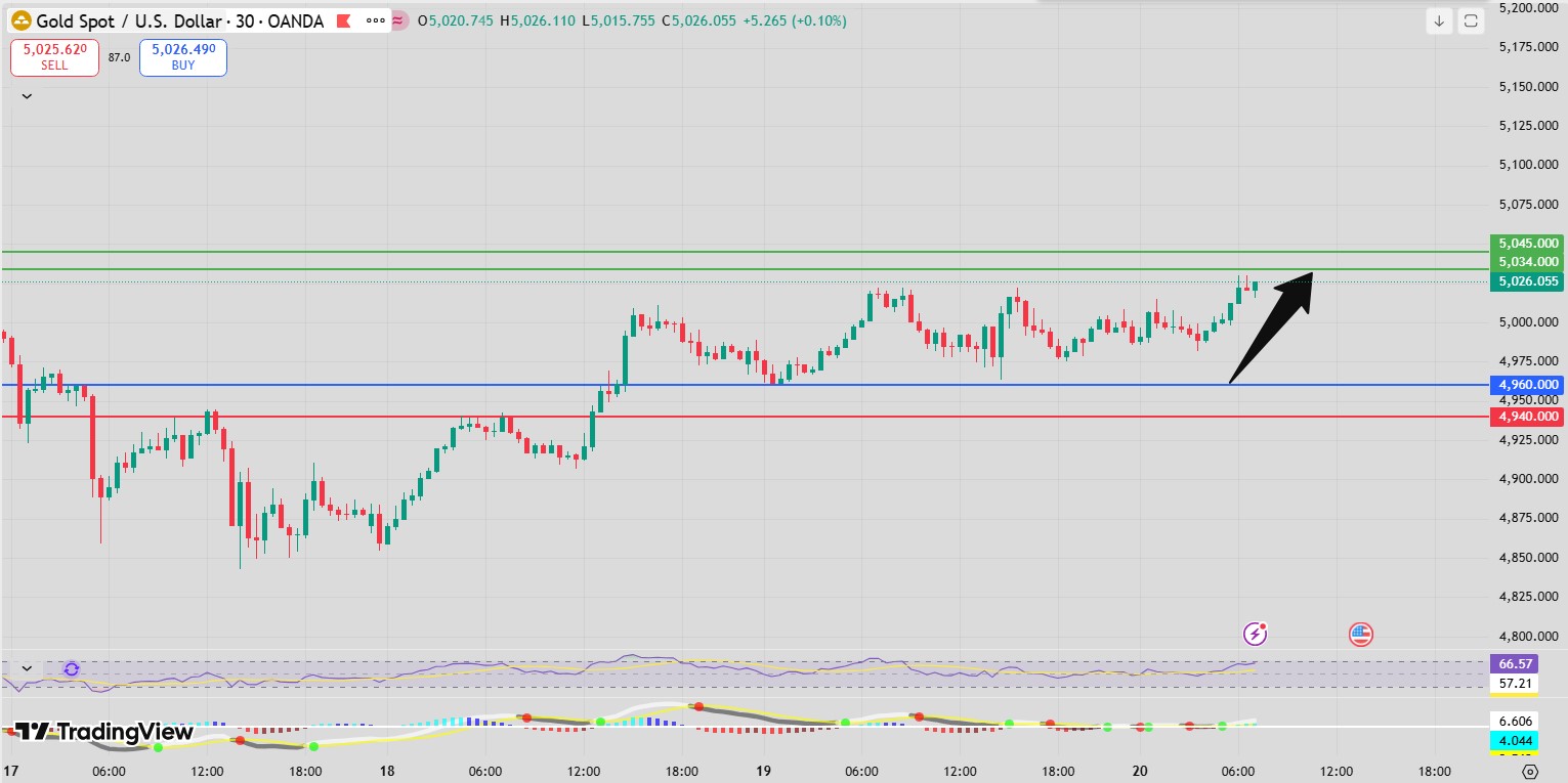 Gold (XAU/USD) continues to display a bullish intraday structure while trading firmly above the pivot support at 4960. The price remains supported by sustained buying pressure, paving the way toward the first resistance at 5034, followed by the extended objective at 5045. As long as the pivot level holds, the upside bias remains intact.