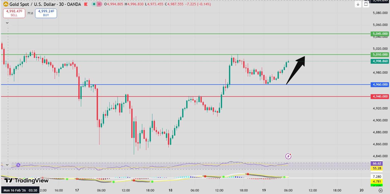 Momentum indicators reinforce the bullish outlook. The RSI shows upside momentum, signaling sustained buying interest and increasing the probability of continuation toward higher levels. As long as price remains above 4960, pullbacks are expected to remain corrective in nature.