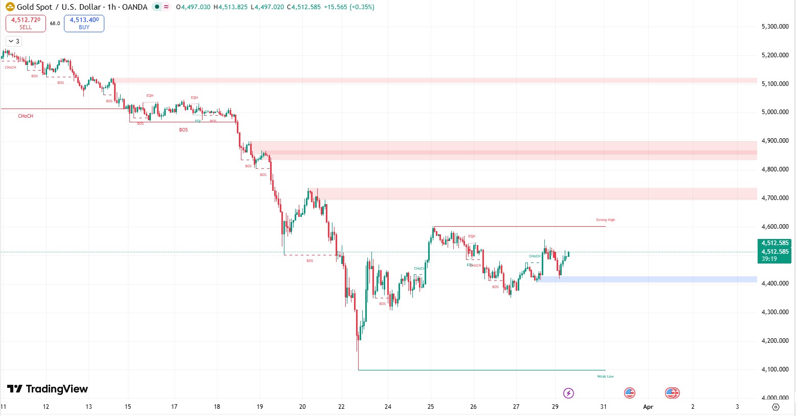 This recovery created a Change of Character (CHoCH) and pushed price toward the 4,550–4,600 resistance zone, where a strong high is now clearly defined. However, price failed to break above this level, confirming that sellers are still defending this supply area.
