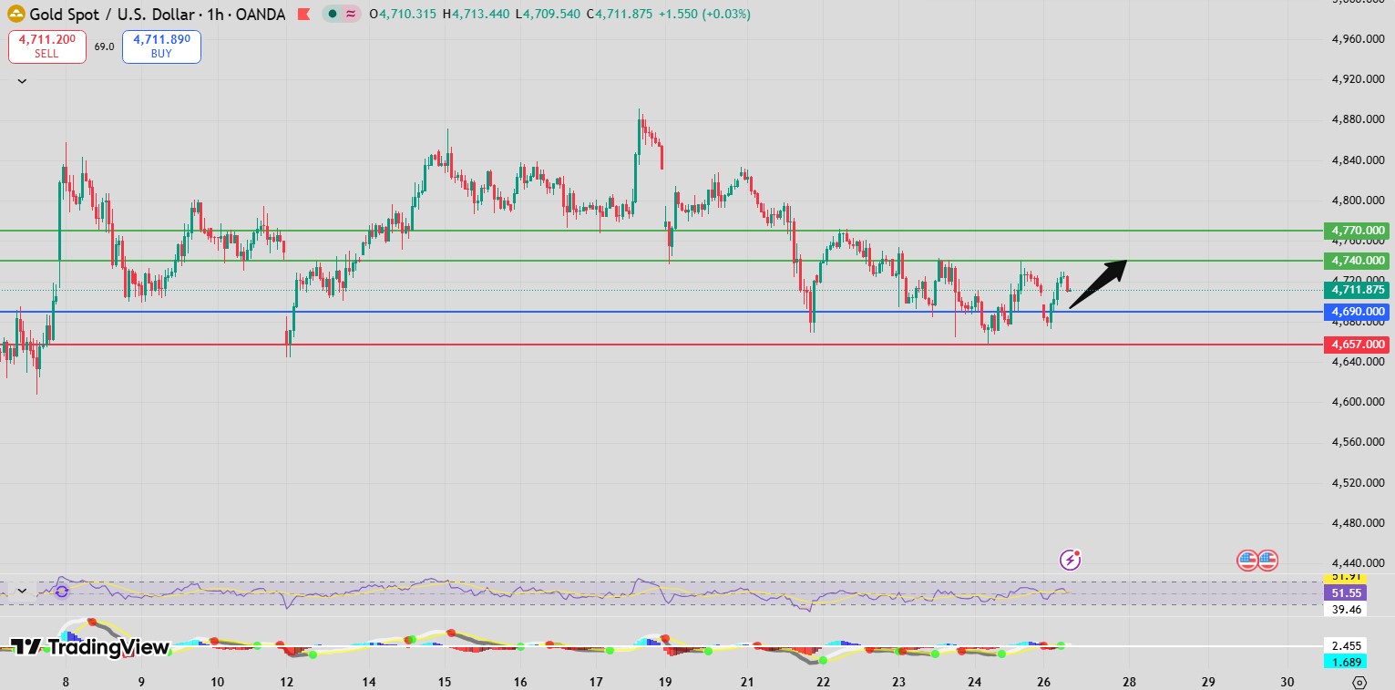 The Gold Intraday Signal reflects continuation of the rebound as price remains supported above the pivot level at 4690. Momentum conditions remain constructive, with the RSI calling for further upside and reinforcing the recovery structure. As long as price trades above 4690, buyers retain short-term control.