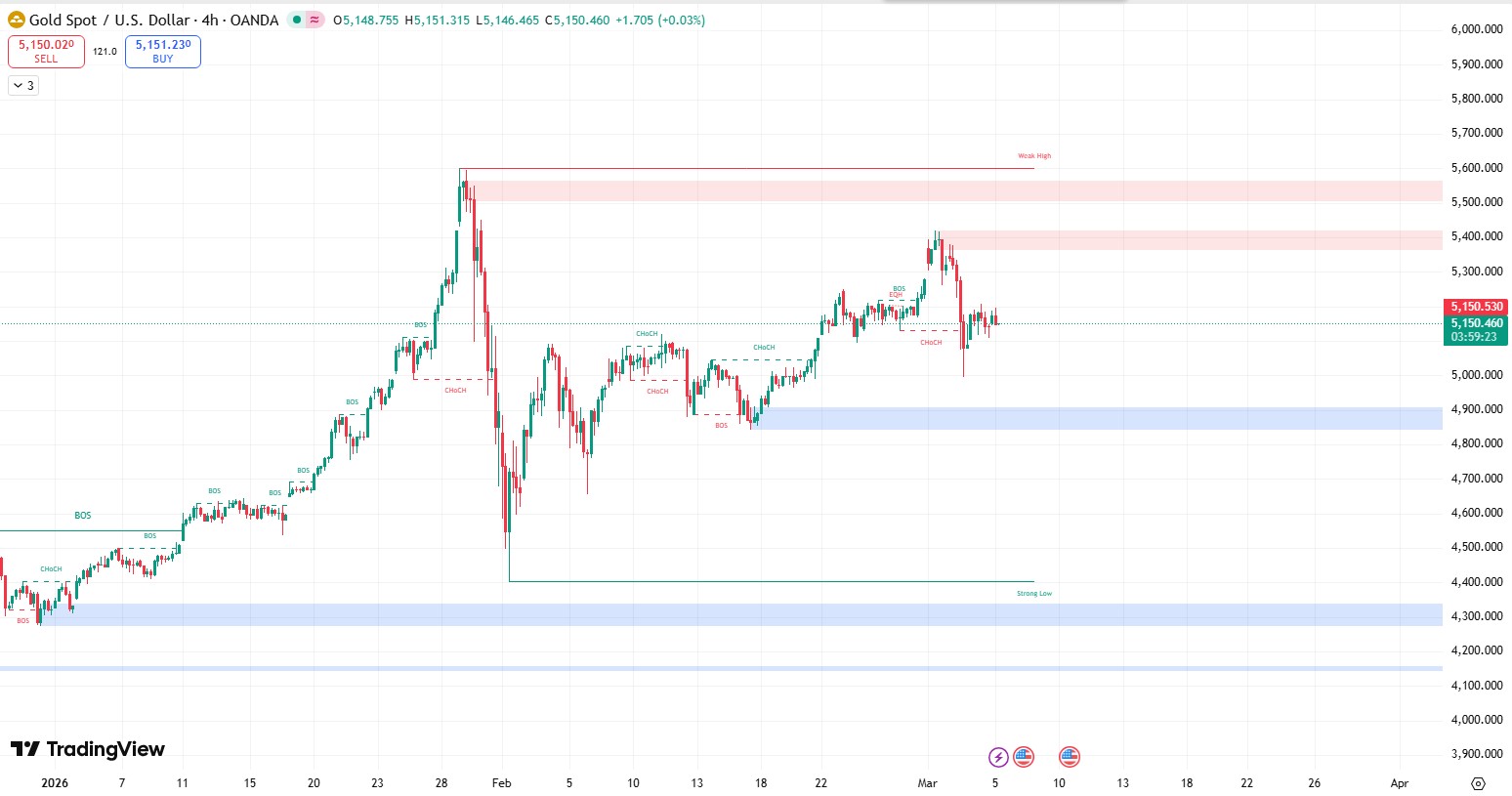 Price is now rotating around the 5150 area, which acts as a short-term equilibrium level inside the broader range. As long as gold remains below the 5400 resistance zone, the market structure favors a continuation toward lower liquidity levels.