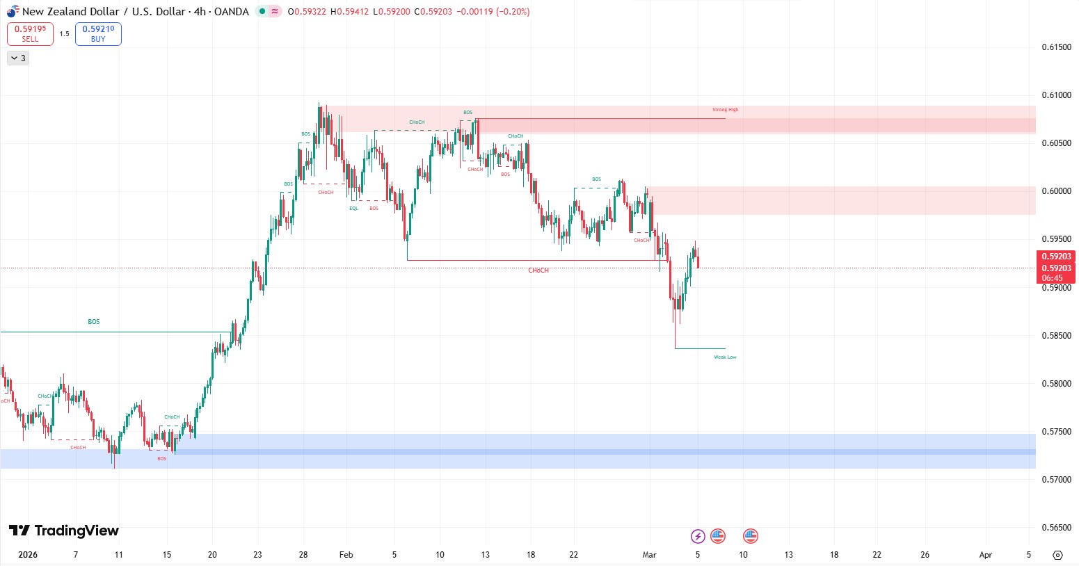 NZD/USD continues to trade within a bearish structure on the 4-hour timeframe after confirming a Change of Character (ChoCH) and breaking below the key 0.6000 support zone. The failure to sustain bullish momentum near the previous supply area indicates that sellers remain dominant in the current market structure.
