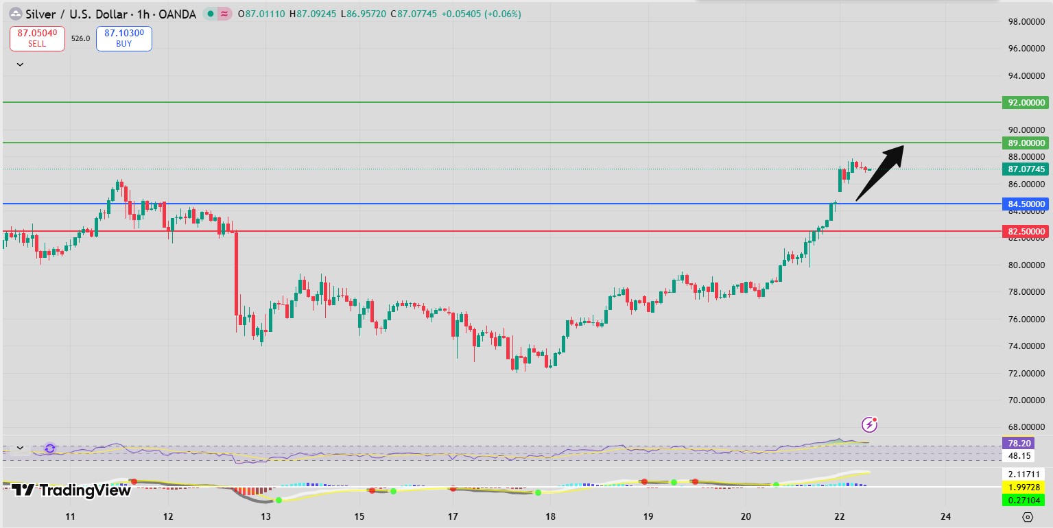Immediate resistance is located at 89.00. A sustained move above this level would confirm renewed buying pressure and likely trigger acceleration toward the extended upside objective at 92.00. Holding above the pivot reinforces the short-term constructive structure and keeps bullish momentum active.