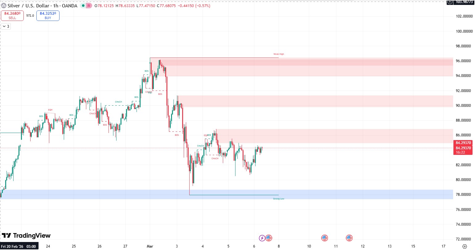 Silver on the 1-hour timeframe remains under bearish pressure following the strong rejection from the 96.00 supply zone. The market structure shifted after a clear Break of Structure (BOS) to the downside, confirming that sellers regained short-term control.