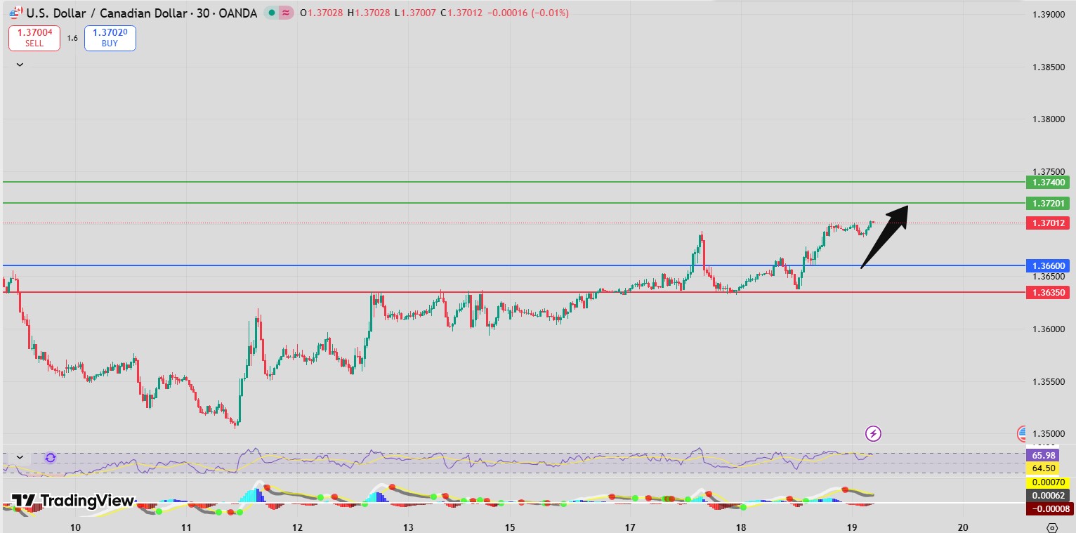 Alternatively, a sustained break below 1.3660 would weaken the bullish setup and expose downside levels at 1.3635 and 1.3610, where renewed selling pressure may emerge.