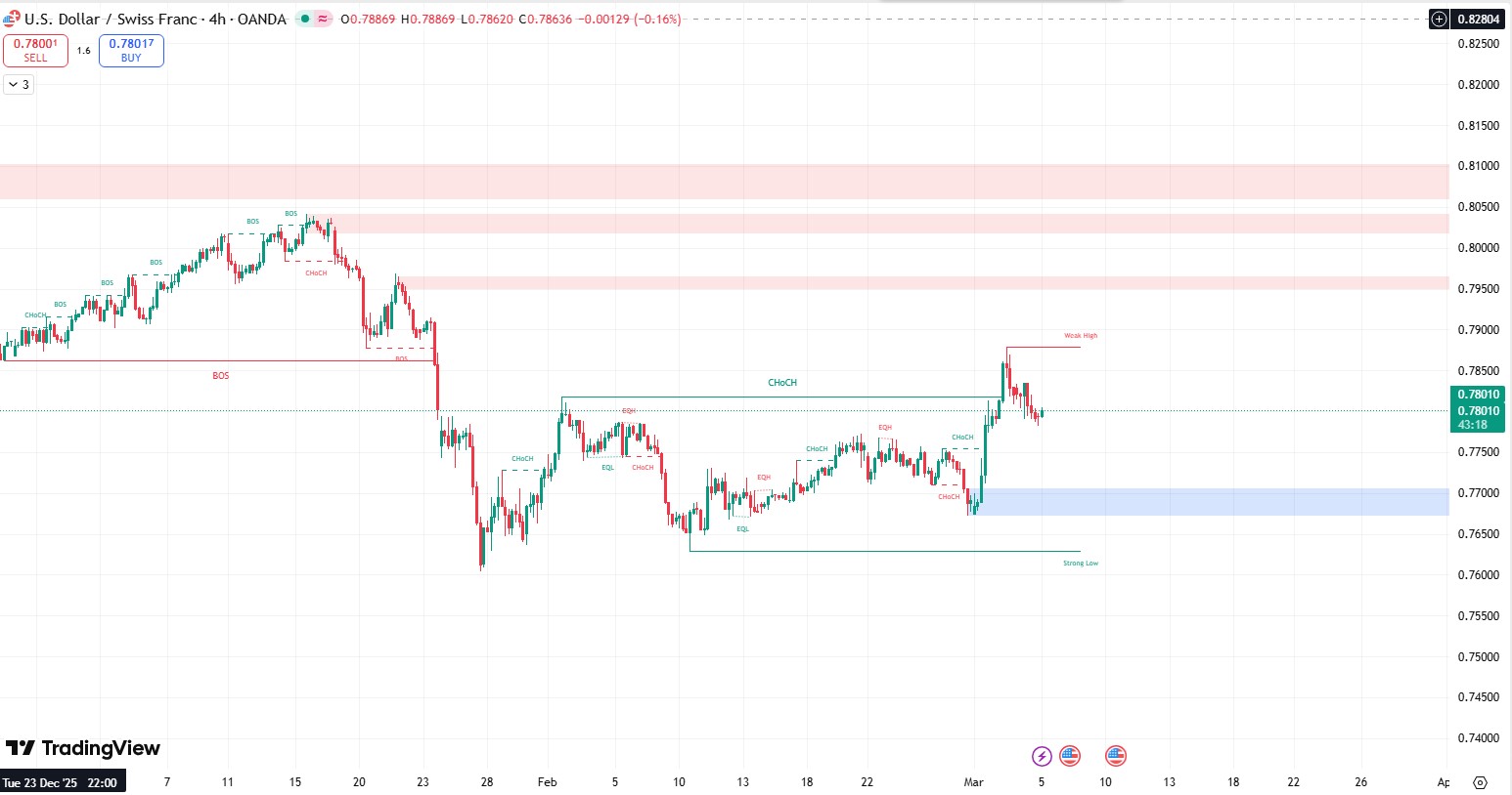 USD/CHF has recently formed a Change of Character (ChoCH) on the 4-hour timeframe, indicating a shift from the previous bearish trend into a short-term recovery phase. However, the latest rally stalled below the 0.7900 resistance zone, forming a weak high and suggesting that buying momentum is fading.