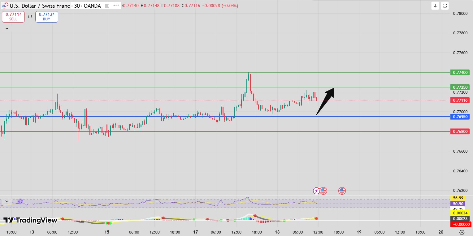 Alternatively, a sustained break below 0.7695 would weaken the bullish setup and expose downside levels at 0.7680 and 0.7665, where fresh selling pressure may emerge.