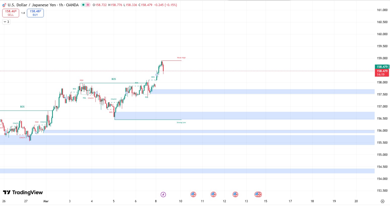 USDJPY on the 1-hour timeframe has been trending upward in the short term after forming a strong low near 156.50, followed by a sequence of higher highs and higher lows. This bullish structure pushed the pair toward the 158.80–159.00 liquidity area, where the market is currently facing resistance.