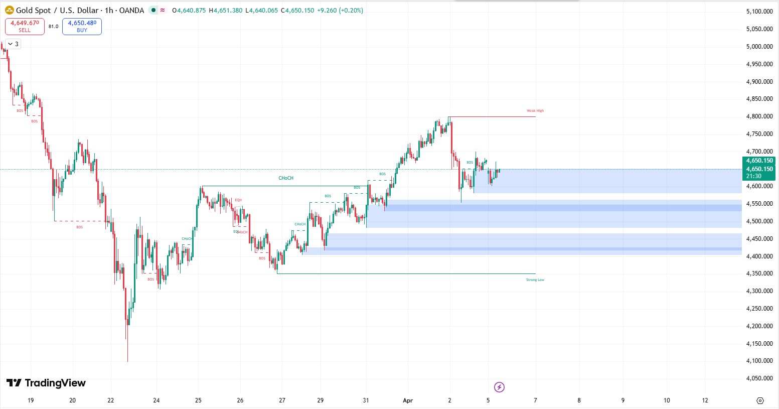 Price is now consolidating inside a well-defined demand zone (4,550–4,600), which aligns with previous BOS and institutional buying activity. The reaction from this zone shows absorption of selling pressure, suggesting that buyers are still active.