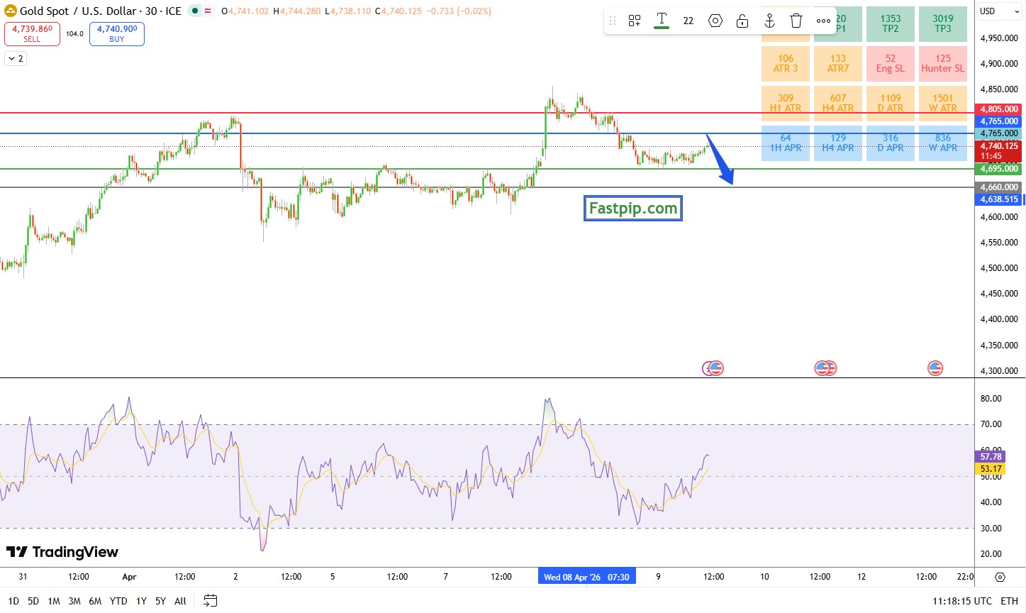 Gold is currently trading below a key resistance level at 4765, which defines the short-term directional bias. The price structure suggests that sellers remain in control as long as this level is not breached.