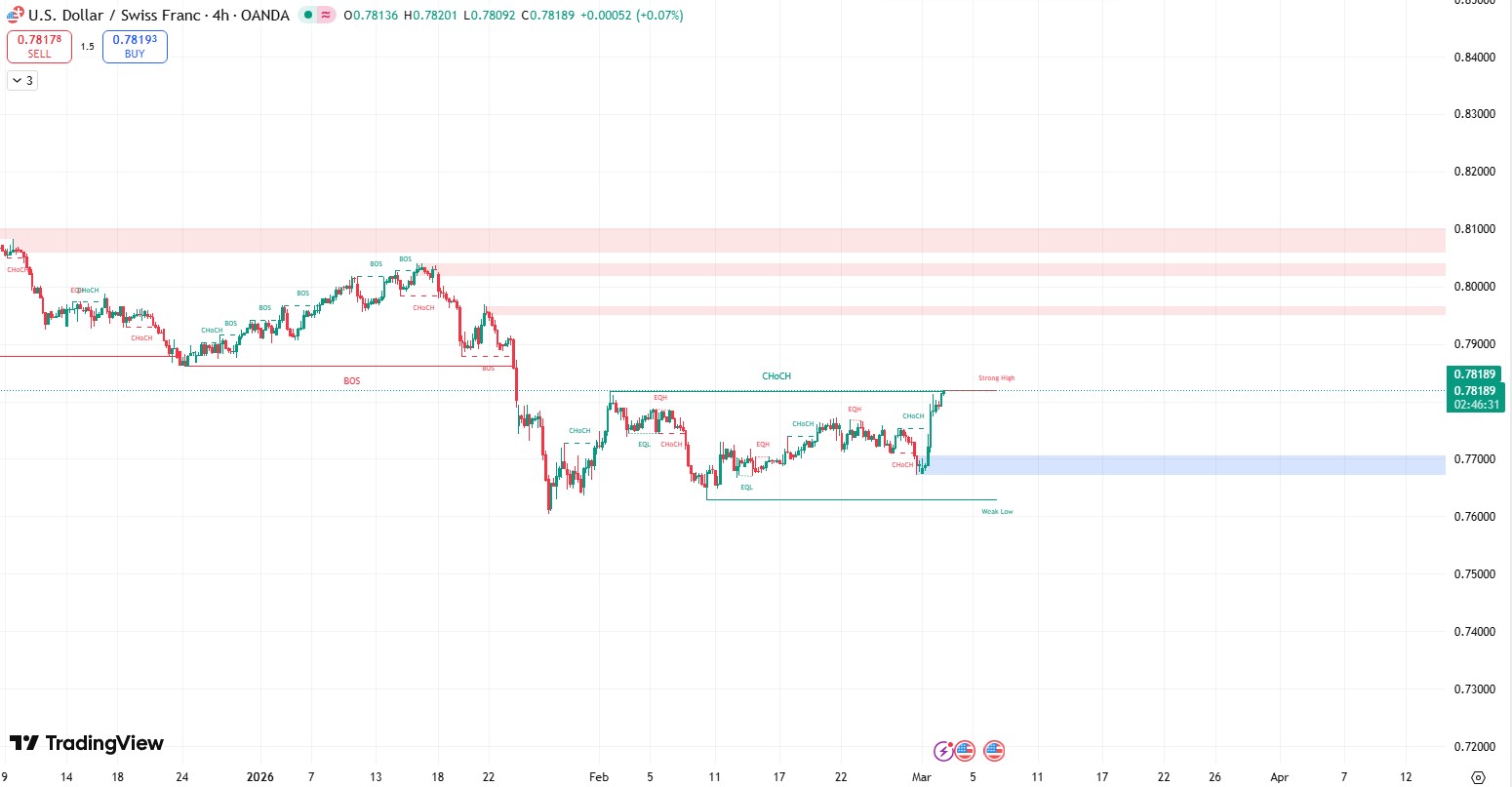 USD/CHF turns bullish above 0.7800, targeting 0.7900 as structure shifts to higher highs.