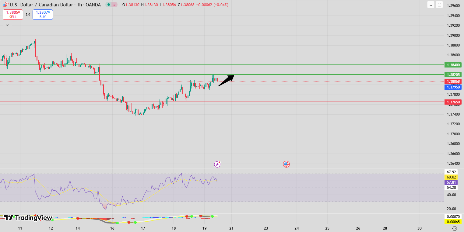 USD/CAD is holding a constructive tone while trading above the pivot level at 1.3785. The RSI shows a mixed setup but leans toward a bullish bias, supporting continued upside. As long as 1.3785 remains support, the pair is expected to extend its advance toward 1.3820 and 1.3840. A break below 1.3785 would expose downside risks toward 1.3765 and 1.3750.