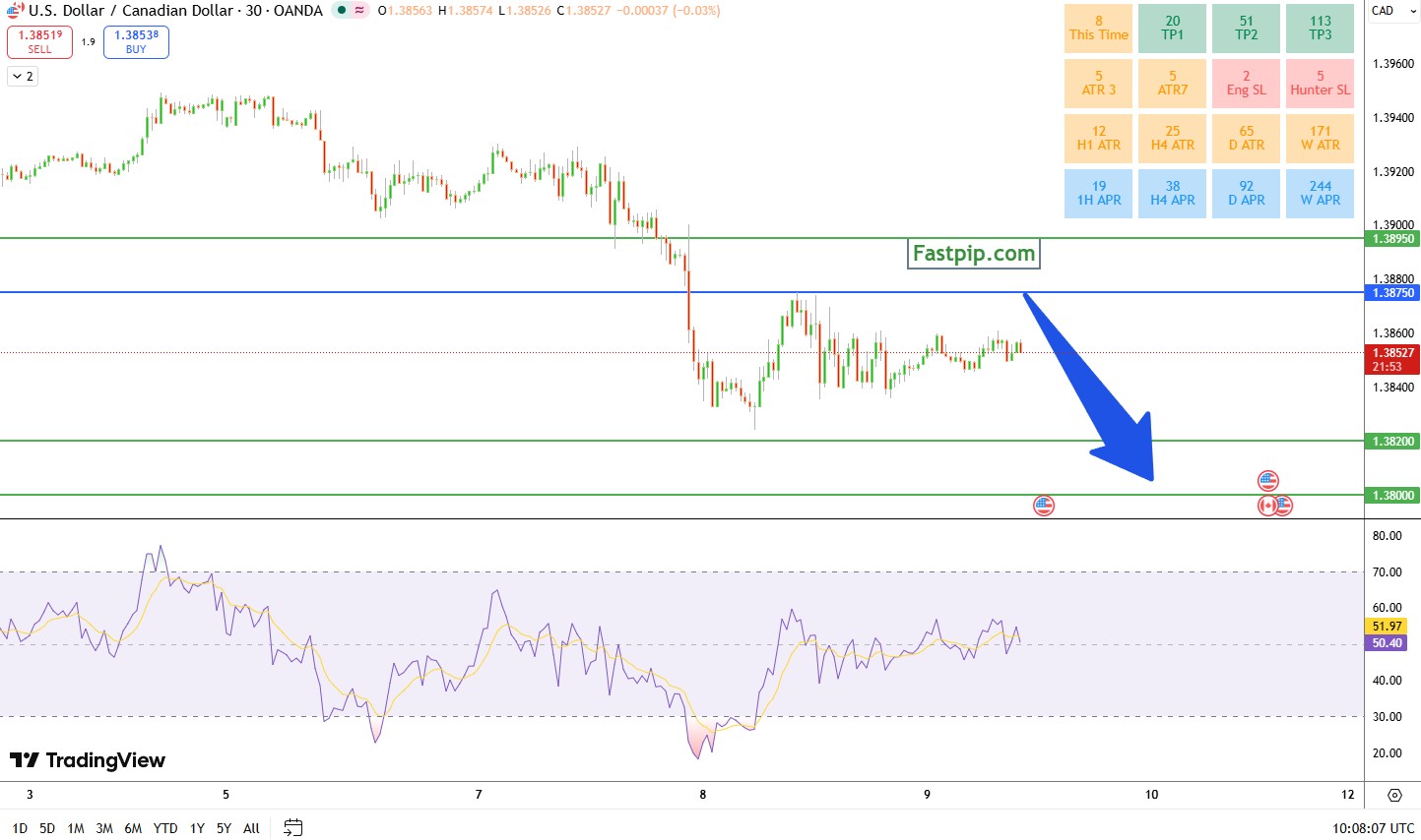USDCAD Sell Signal: Bearish Bias Below 1.3875 with Targets at 1.3820 and 1.3800