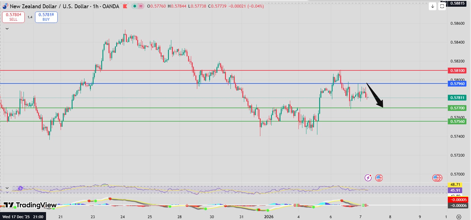 NZD/USD remains bearish below 0.5796, targeting 0.5756 as RSI, MACD, and moving averages confirm downside momentum.